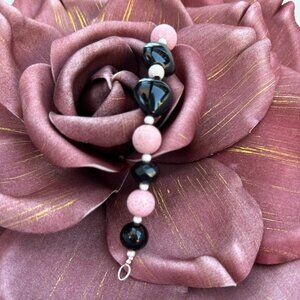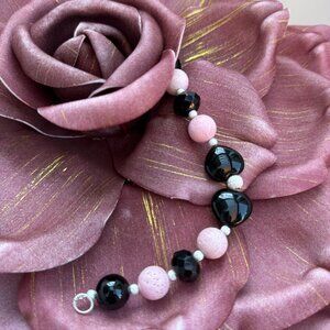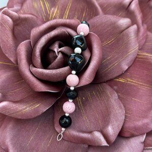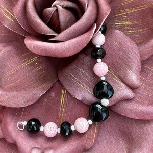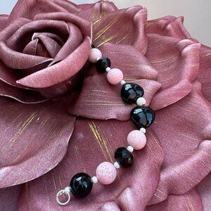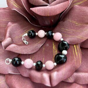 Hand Made Silver, Pink Coral and Black Onyx Bracelet by Anwen Jewelry. 14/15 mm round , two onyx heart shape in the middle.