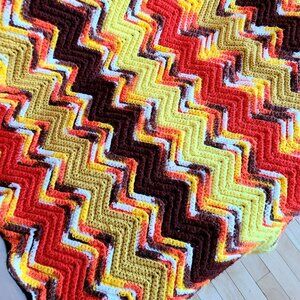 Hand Made Crochet Throw Afghan Blanket with Bright Yellow Orange Brown Colors Home Bedroom Decor. Fire Colors Bed Cover.