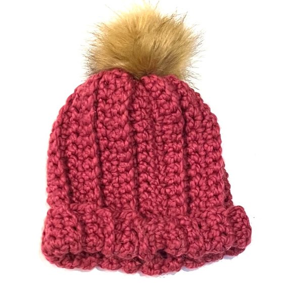 Hand Made Pom Beanie Chunky Stitch Raspberry Color