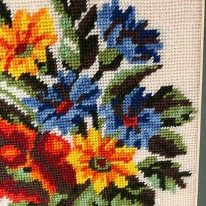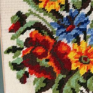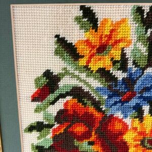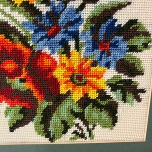 A simply beautiful and vibrant wool needlework in a gold tone custom frame. Ready to hang. Measures 11.5 inches square. From a smoke free home.