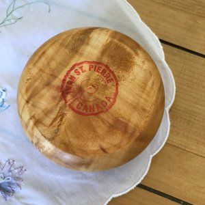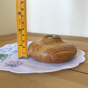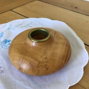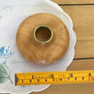 Small wooden candle holder made in Canada by Ivan St. Pierre. 1 1/2" tall x 3 1/2" wide. Hole for candle measures 7/8" across. Pre-owned condition, some surface wear & wax residue.