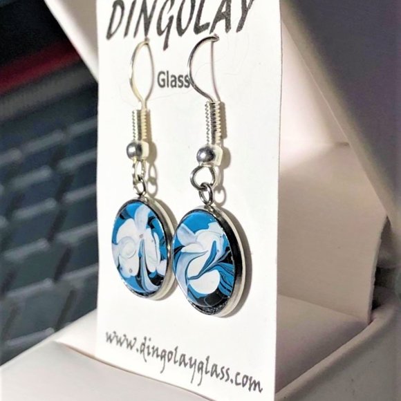 I hand paint inside the bezel tray with acrylic teal, white and black and then top it off with a clear glass dome to enhance the design. Attach the hooks that are silver plate (nickel and lead free). Glass part measures 12mm round.