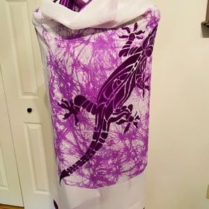 Beautiful hand painted coverup that can be used as a wrap, beach coverup, sarong etc. Features a lizard motif in various shades of vibrant purples with an off white background. Measures approximately 68” long x 41” wide. Silk like fabric that is very soft and supple and is a gorgeous statement piece. One very small pin hole where tag was.