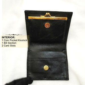 Beautiful Hand Painted Black Leather Wallet, Genuine Leather with artistic Hand Painted motifs with 3D Red Berries and Green Leaves. A Rectangular Bifold Wallet Cardholder features 1 Coin Purse with Kiss lock, 1 Bills Section and 2 Card Slots. Interior Magnetic Snap Button Closure. Brand New without tag.