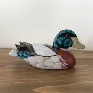 Hand painted wooden mallard duck figurine. 5 1/2" long x 3" tall x 2" wide. Pre-owned condition: Paint is chipped on the very end of the duck's bill, in otherwise excellent condition.