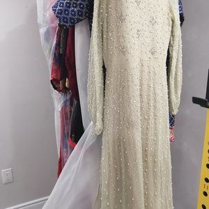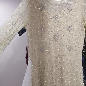 This is a beautiful dainty elegant dress in a cool cream color. It has sheer sleeves and a lining for the main body of the dress. It is a size small/xs. Hand made and beautifully designed. Due to the delicate nature of the dress it is normal for some beads and threads to be loose.