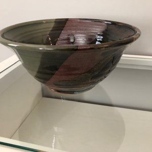 Large salad or serving bowl in sage green and rust brown tones. Made by local potter on Vancouver Island. Excellent condition - no cracks or chips. Note this serving bowl matches the smaller candy, nut bowls also for sale.
