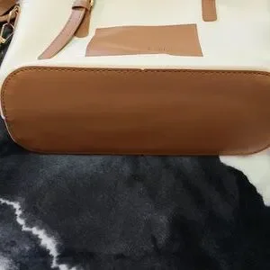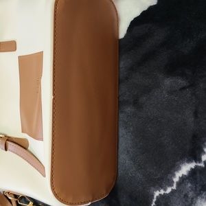 off white and brown hand bag.Also can be used as cross body bag straps are adjustable. very roomy from inside. a small pocket on the outside for keys,phone, etc.new, never used, also it comes from a smoke-free and pet free house.