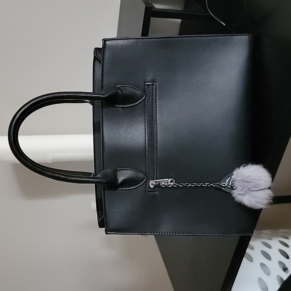 A hard leather black handbag with the zipper. Inside plenty of space with two zipper pockets and two open pockets.