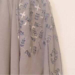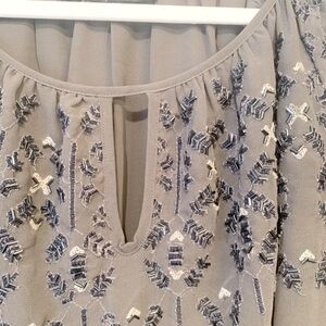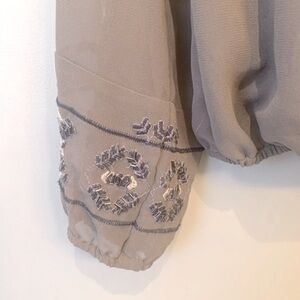 Semi-sheer grey top has an elasticized waist and sleeves. Very roomy through the body.