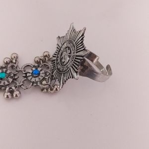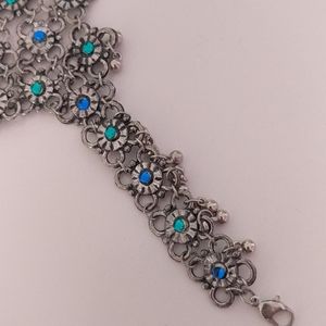 Silver handchain with attached ring. Blue and turquoise gems set in an artificial German silver finish. This item is a traditionally Indian but suits all cultural clothing! The ring is adjustable and bracelet has an extension clip.