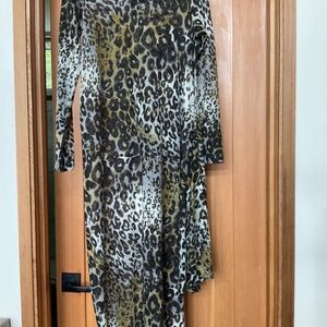 Fabric is a very light weight linen wool blend….great layering piece. Very sheer and usually worn with a black slip on it’s own. One of a kind….as I designed and fabricated.