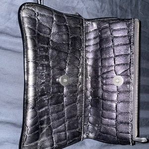 Small hand held purse, black with a silver Vera Wang symbol on the front. Two pockets one with a zipper, one with a magnet clasp