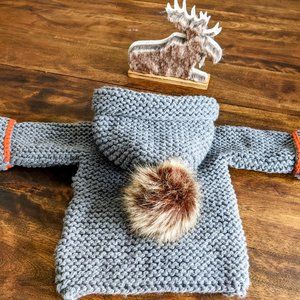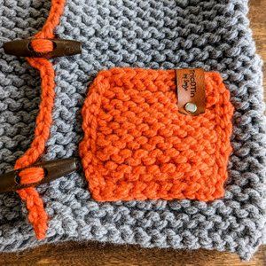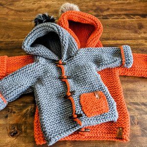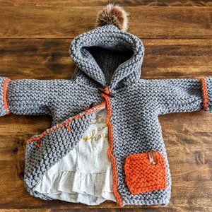 New, never worn, dark grey baby coat with orange pocket and cape , wooden buttons ( dark brown ) and pompom , generous fit.