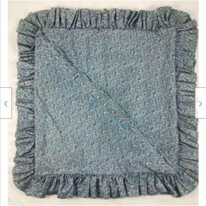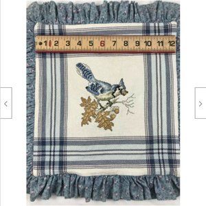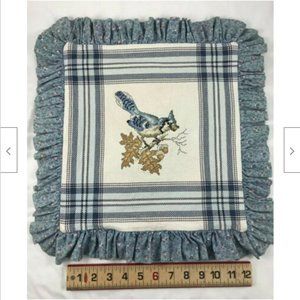 Hand made cushion cover has a cross-stitched Blue Jay bird on the front, sewn to a blue floral cotton backing fabric. Velcro closure on back. Will fit a 14" cushion (cushion not included). Flat measurements are 16 1/2" wide x 17" tall including ruffle. Minor wear/fading to floral fabric.
