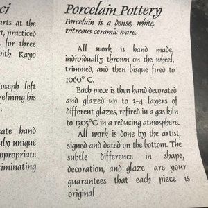 Canadian made. 100% PROCELAIN hand made (no mould) and hand painted pottery. Signed & dated by artist. 2 Bowls. Larger: 10.5" diameter/3.5" height. Smaller" 7" diameter/ 3" height.
