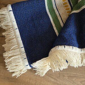 47'' x 68''. No material tag. Feels like wool or wool blend. Has a couple faint stains. Overall is good condition.