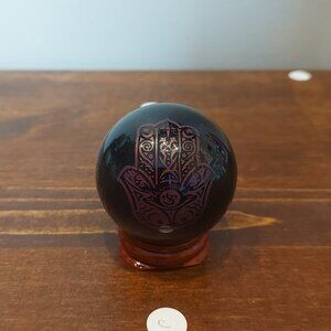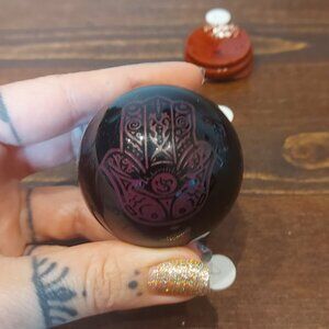 Hand of Hamsa handprint is an orlay in a plum/purple shade which as been placed on the sphere and cannot be removed.