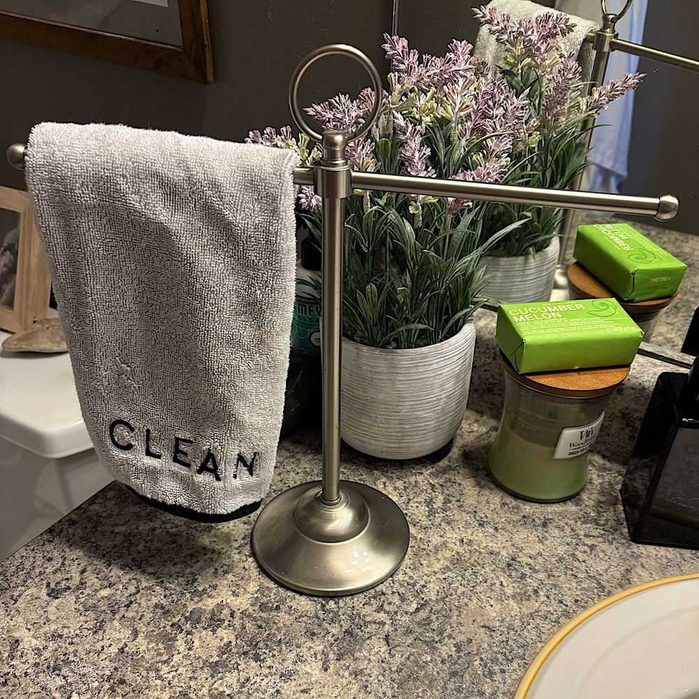 Approximately 13”, brushed nickel rack to hold hand towels, wash cloths, headbands, etc , on your bathroom countertop. Or use it in your kitchen to hold dishcloths, or dry Stasher bags.