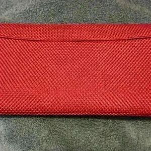Red clutch hand woven with a beaded accent in like new condition super cute and would go great with any outfit dress up or dress down and pretty open inside to fit your stuff also hilt with a sturdy structure
