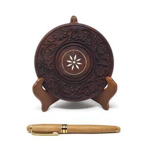 Hand-Carved Round Wooden Trivet with Floral Design and White Inlay | Vintage Pot Rest | Boho Dining
