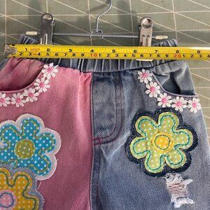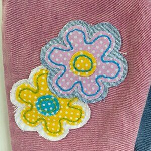 These one-of-a-kind jeans are a playful mix of pink and blue denim, perfect for little explorers with big style! Lovingly decorated with hand-embroidered floral appliqués in cheerful colors like yellow, turquoise, pink, and green. Sweet daisy trim accents the front pockets for an extra touch of charm.
