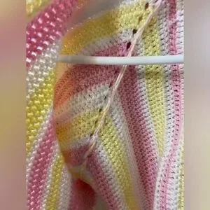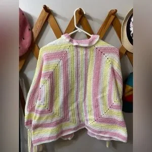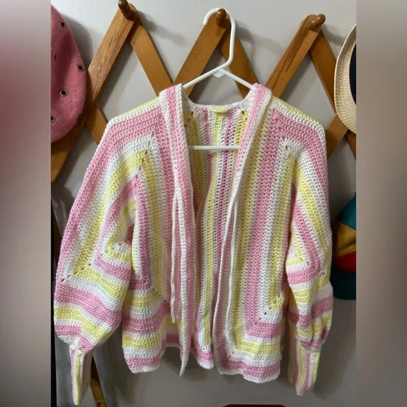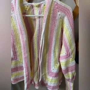 Adorable handknit cardigan sweater in white, pink and yellow. Puff sleeves, exaggerated cuffs and ruffled collar. No size or tags but fits like a M. Think granny square but a little more unique.