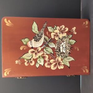 Beautiful wooden box with hand-painted floral and bird design. Perfect for storing small items.