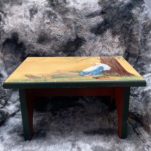 This hand-painted rustic art stool features a serene nature scene with vibrant colors. Perfect for adding a touch of artistic charm to your home decor. Very good condition no chips to painted picture just o few on the legs