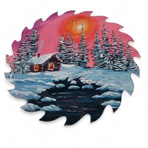 Unique 7" hand-painted saw blade by Canadian artist Ann Simmons, featuring a cozy cabin by a snowy stream under a vibrant pink and orange sky. Rustic, folk-art style perfect for cabin décor, cottagecore vibes, or as a one-of-a-kind gift.