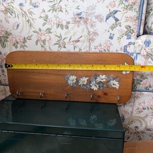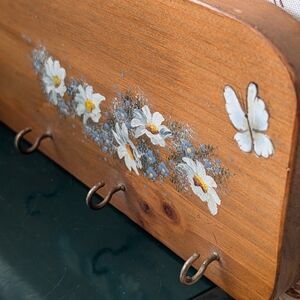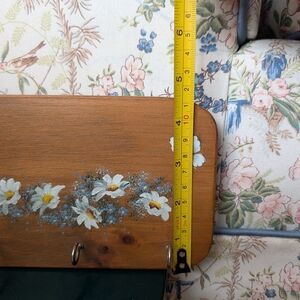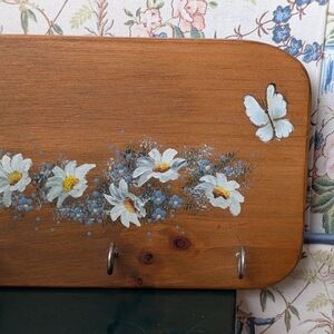 Hand-painted wooden wall key rack featuring white daisy flowers. Warm brown finish complements classic and cottage decor. Five metal hooks provide organized, accessible storage. Subtle hand-painted detail adds a charming focal point. there is one minor knick in the board, as picture, otherwise in perfect condition