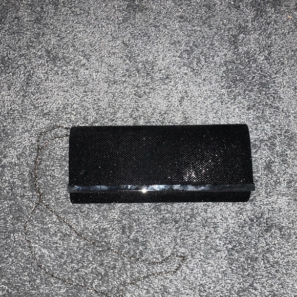 Handbag with metal chain link strap. Black with gold bar and magnetic button to close purse. With card holder pocket on inside