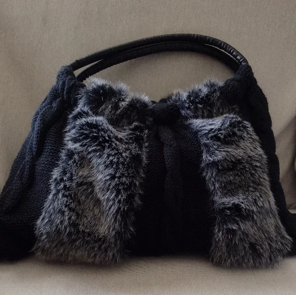 New without tags,knit and faux fur purse. Fully lined, zipper closure, roomy. Measures 19"Lx11"H, 6" handle drop