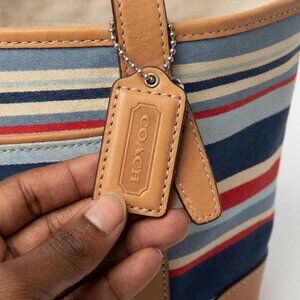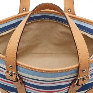 Add a pop of color to your wardrobe with this stylish striped canvas tote bag. Designed with durable tan leather accents and dual buckle handles, it’s the perfect blend of casual and chic for everyday use.