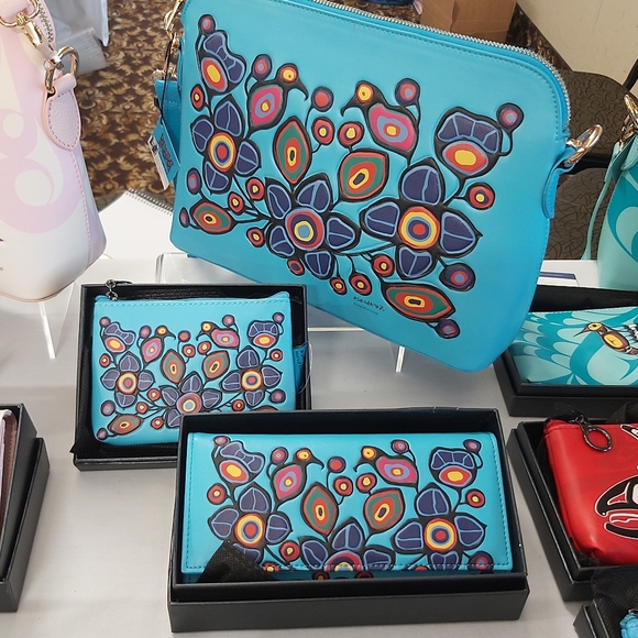 Vegan leather handbag, wallet and coin purse designed by Canadian Native Artist. photos don't do justice for this gorgeous set.