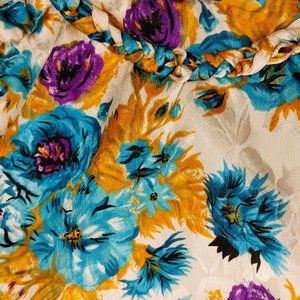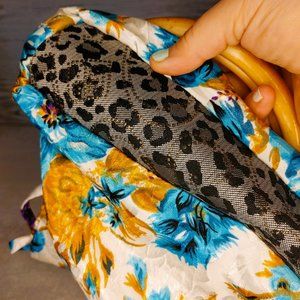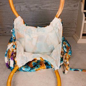 This beautiful satin bag is unique in all the right ways! it's floral design is striking and the wooden handle brings it all together to make it a statement piece. It's 12 inches tall and 11 inches wide.
