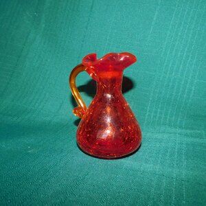 Add a touch of elegance to your home with this stunning handcrafted red crackle glass pitcher with a yellow handle
