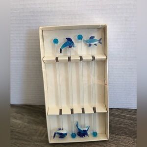 Enhance your barware collection with this elegant set of marine animal stir sticks. Includes what I believe is: one dolphin, one shark, one whale and one fish?