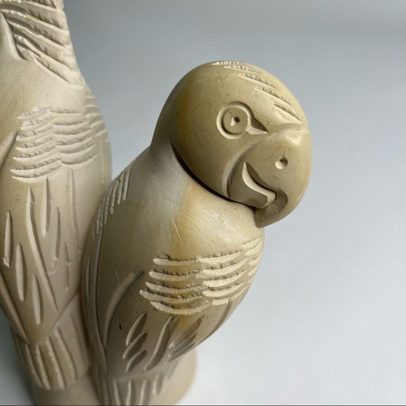 Soapstone parrot duo sculpture hand-carved in Cuba. It’s unique detail from the craftsmanship of the work by hand is beautiful in person. They are perfectly imperfect due to the fact that they are hand-carved. The soapstone is a pale cream color with slight pale tan colored lines running through it. Naturally it is quite heavy bc of the soapstone. There are a few small black scuff marks on the back and near the bottom. Please see photos for details and measurements.