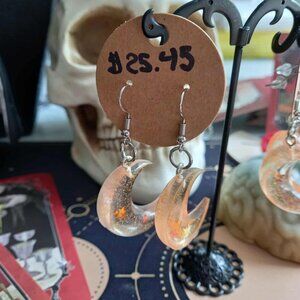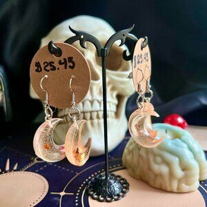 Handcrafted Artisan Jewelry Resin Crescent Moon Maple Leaves Gothic Earrings