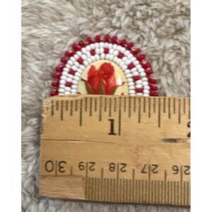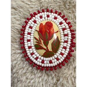 This intricately beaded brooch showcases a vibrant red rose centerpiece surrounded by white and red beads. A secure pin-back closure ensures easy wear.
