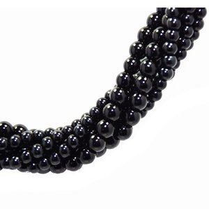 15” necklace made of beautiful braided black faux-pearl beads in various sizes, handcrafted. Clasp closure.