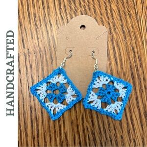 Handcrafted Blue & White Crochet Earrings | Square Boho Drops | Artisan Jewelry