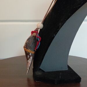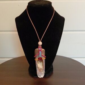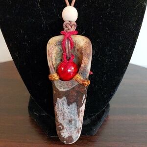 This unique handcrafted necklace features a striking bone pendant with a vibrant red accent. Perfect for adding a touch of natural elegance to any outfit. This necklace is handmade and one of its kind. The leather cord has a drop of 12".