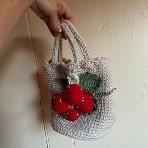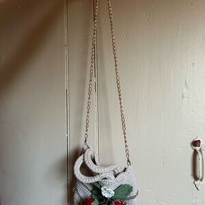 Handmade crochet strawberry bag that can be worn as a crossbody or as a tote. In beautiful condition. This elegant handcrafted cream crochet bag features charming red accents.