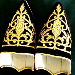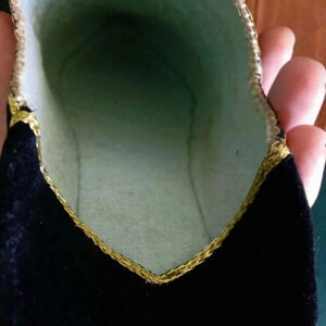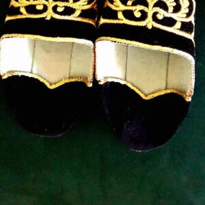 Absolutely stunning handmade pair of moroccan traditional babouche in black velvet richly embroidered with gold metalic thread.