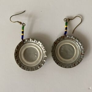 Handcrafted Fanta bottle earrings. Hand made in Tanzania. Bought while travelling years ago. Made from the tops of a Fanta bottle. Well loved and show signs of wear. Some rusting on the bottle lids adds character.