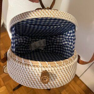 This handwoven round rattan bag is bursting with personality, thanks to the vibrant painted daffodil & pansy floral design on the front. With a structured shape, genuine leather strap, and cheerful blue gingham lining, it’s ready for weekend markets, picnics, or sunny city strolls.