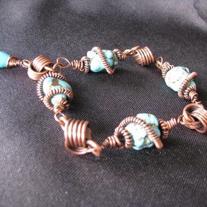 Two handmade turquoise and copper bracelets. One fashioned with natural turquoise nuggets the other with turquoise beads. Briolette accent is not genuine turqoise.