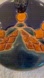 Unique, handcrafted ceramic pendant necklace with an adjustable black braided cord. This striking circular pendant features a glossy, dark glaze (navy/black) with an abstract, earthy-toned design that resembles stylized mountains under a moon/sun motif.